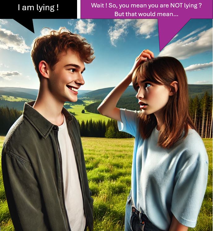 Consider the conversation in this figure. The man on the left is saying – “I am lying”.