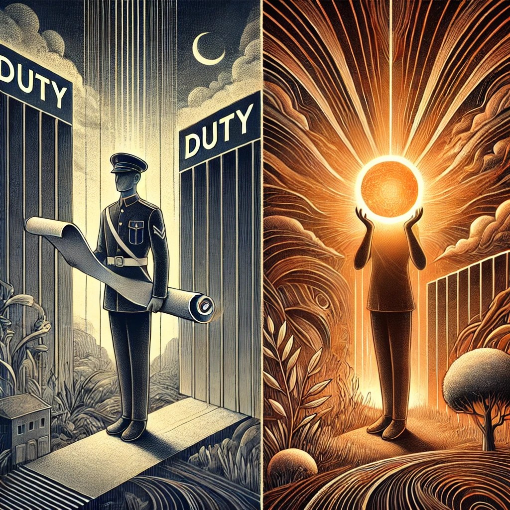 So the paradox arises from the conflict – Does true fulfillment come from adhering to externally imposed duties or from following a deeply personal responsibility to our inner call.